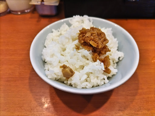 そして肝心のライスは100円でセルフ食べ放題。 卓上に漬物などは無いものの、代わりにとんでもないお供がセルフコーナーに存在します。 それが【ライス用やみつきニンニク】 自家製タレに漬け込んだニンニクを細かくみじん切りにした物を適量スプーンですくってライスに盛り付けていただきます。