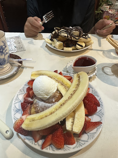 My son and I places two orders the milk butter pancakes chocolate banana and the strawberry banana pancakes. To our surprise they come with vanilla ice cream on top. They were finger licking food!!! Along with a juice and coffee we ended up paying around 4,000 yen.