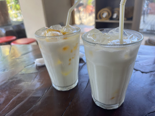 I enjoyed a cold Mango Lassi at the outside seating right next to my dog! There is one table where you are allowed to sit with your dog outside!