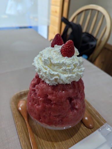 Read moreI tried two places for kakigori this trip. This place is absolutely wonderful! There IS a wait and it is worth it. I had the strawberry pistachio kakigori and my partner had the pistachio. I just finished the large portion and was so happily satisfied. The shaved ice is like fluff! Delicate and melts quickly in the mouth. The flavors were SO good, chunks of strawberries and whole pistachios layered in as well as a pistachio cream pour over that I wanted to pick clean. Pricing was approx $14-20 CDN and well worth it. The interior is light and spacious and it was fun watching the staff shave the ice and build these amazing treats. Will 100% be returning, I need to try the lemon kakigori next!! English menu...