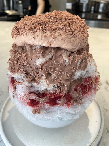 The staff were very friendly and welcoming when I entered and gave me some water while I selected my dish. Some of them also speak English making this easy for tourists to access. I ordered the chocolate and raspberry shaved ice for ¥3000. When it was served it looked absolutely huge - shaved ice with a layer of raspberries and raspberry sauce, another layer of chocolate sauce with a chocolate mousse on top and shaved chocolate all over the top. Outstanding!!!!It was not overly sweet and the shaved ice dumb down the sweetness a little, making it very pleasant and not overwhelmingly sweet to eat. There also seem to be some marshmallows in a bottom layer, underneath the raspberries, adding to the different texture of the dish.