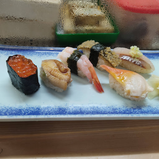 準備が整ってからガリがのった平皿がカウンター越しに置かれました。最初は、 鮪2貫、サーモン、蛸、海老、烏賊、の6貫、 玉子、子持ち昆布、甘海老、穴子、の4貫、 飛魚、青柳、鰤、イクラ、とびっこ、の5貫、をいただきました。女性だとボリュームあり過ぎかもしれません。
