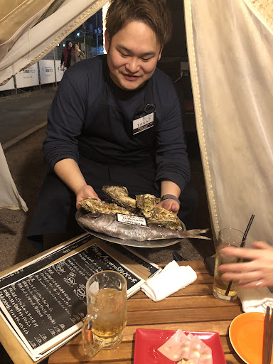 Food here is very high quality. It’s basically an Italian seafood restaurant. They have fresh oysters at the ready and they will prepare baked fishes and other seafood. They service here is very high quality but that could be considered normal here in Japan. We reserved to sit in the tents outside which are so very charming and unusual. Inside the tent was wifi, a Bluetooth speaker a heater a table and cozy chairs. The tents are good for about 4-6 people depending on your size.
