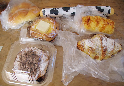 カレーパン、明太フランス、クロワッサンダマンド、ミルキーフランス、レーズンシナモン。