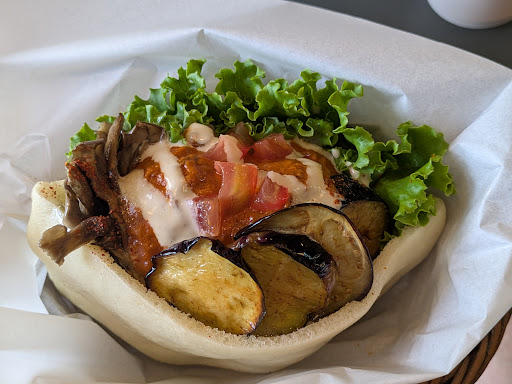 This is not classic falafel. The balls themselves are a little bit smoother and fluffier than the the coarsly ground chickpea balls I'm used to, but they were still super crispy on the outside. There also wasn't a heavy sesame tahini flavor, like most falafel. Instead, there was soft, smooth, and silky eggplant. Plus a bunch of other salad-like marinated vegetables. Also, some potato salad.
