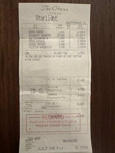 Starlight Lounge at the top of The Okura hotel is perfect for cocktails, conversation and views across to Western Tokyo from Toranomon. We were a party of 3 meeting up for drinks from 5-7pm on a Saturday to relax and chat. Bottle of champagne, sparkling water, and a selection of substantial canapés. The surroundings of the hotel, and the uniformed service, are both first class. Pricey as you’d expect from perhaps Tokyo’s most elegant hotel, but worth it. David...