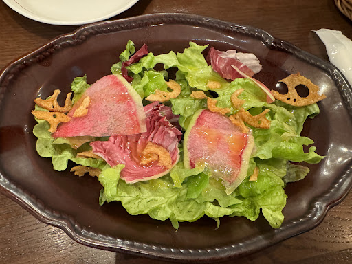 サラダが最初に運ばれて来た。「サニーレタス、紅芯大根、揚げた蓮根チップ」…レタスや紅芯大根はシャキシャキ食感。揚げた蓮根のカリカリ感が効果的。ドレッシングは普通にフレンチドレッシング。サラダはなかなか美味しかった。