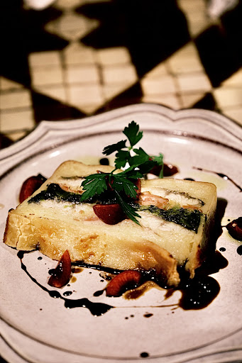 ・真鯛とりんごのカルパッチョ 880円 薄切りのりんごがサンドされた真鯛のカルパッチョです。アンチョビとりんごのソースがかかっています。 周りにはカラスミが添えてあり、好みに合わせて一緒に食べます。 りんごがとても薄切りなので主張は激しくないのですが、ほのかな酸味とシャキシャキとした食感がアクセントとなり、爽やかで美味しいカルパッチョでした。