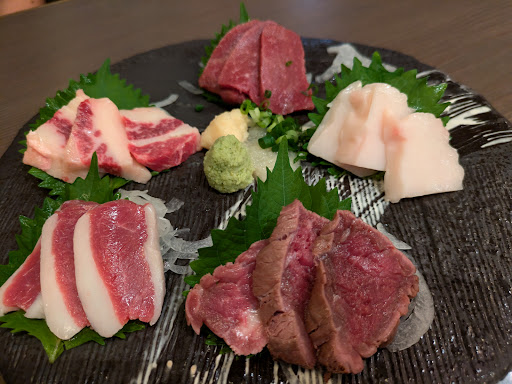 馬刺しの盛り合わせには霜降り、たてがみ、ヒレたたき、ロース、ハラミ、ヒモ刺し、ふたえご、脊髄が盛られています。