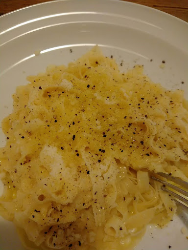 The first thing I would say about here is that's it's primarily a pasta shop, where you can buy premium, hand made pasta, and is produced by the owner at the front of the building. There is a big window there so from time to time, you'll be able to watch his master craft. In the evening he opens up a very small restaurant to seat around 8 people and you can order a couple of dishes that he produces. He admittedly says that he isn't a chef and he's more of a pasta maker, and only sells 2 types of dish, but they are cooked to perfection and he puts emphasis on the taste and texture of the pasta itself, so don't expect any big flavour sauces... However, the quality of his work is second to none and is by far some of the most delicate and tender pasta I've tried.