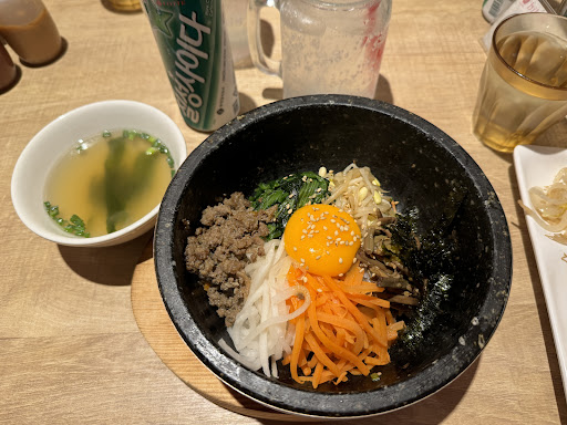 Got there 15 mins before last order because the restaurant was surprisingly hard to find - learned a lesson paying good money to the JR station today going back into the same station. The staff was very kind and quickly put in my bibimbap with side dishes order for me and tidied up a table. The restaurant was great because they automatically only have stone bowl (warm) bibimbap unlike the one in Takashimiya which for some reason defaults to a cold cheap option (tin bowl apparently represents cold). They were able to communicate no issues with English (staff was Korean, and impressively at least tri-lingual, courteous), and also I remembered how to say thank you in Korean when they said it. The seaweed soup was slightly oversalted but that's kind of customary in Tokyo, side dishes were good with lotus root, bean sprouts and kimchi....
