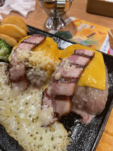 手こねハンバーグが人工の油脂を注入してあるのではないかと思うほどで、極めて脂っぽい。鉄板の下に敷いてあった玉ねぎスライスが脂で染まっていた。テーブルにあった紙ナプキン4枚で吸着させてからでないと食べられないレベル。