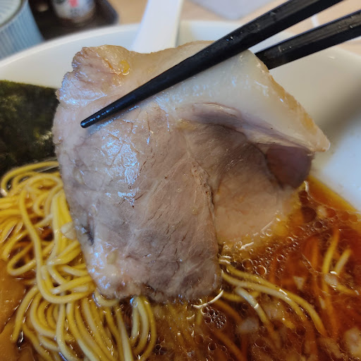 醤油ベースのスープは八王子系で比較するとややこってり目の味付けかなと思います。 油分も豊富で塩気もしっかりとしているので、玉ねぎとの相性も良いと感じました。 チャーシューの味付けがあっさりしているので、チャーシューめんで考えてもバランスは良いのかなと。