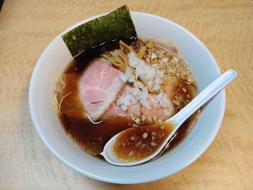 The ramen here is a classic Hachioji-style soy sauce ramen with a slightly sweet broth, topped with chopped onions.