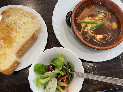 Elegant setting for charcoal-roasted coffee in antique cups, along with sweets, soft-serve & stews.