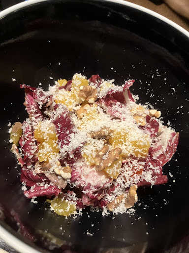 The food was not very varied let's say, but if you don't mind, there were a lot of unique dishes on the menu... I had the trevis and walnut insalata and the wood-grilled grass-fed beef sirloin. I was told that the salad was made with sweet fish (ayu) sauce. It was sour, but not fishy, and the orange provided a nice accent. The sirloin was very tender and of high quality, but it would have been better if the flavor could have been varied.