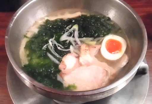 ステンレス製の厚手の器に、チャーシュー、煮玉子(半分)、穂先メンマが載り、そのほかの大半を「あおさのり」が占めています。玉子の赤い黄身が印象的です。あおさのりの上には、刻んだ長ねぎと紫玉ねぎが添えられています。