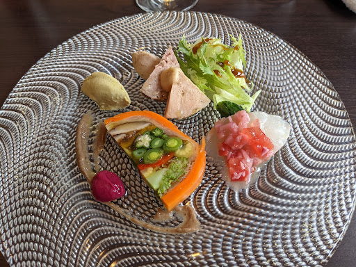 ⬛︎前菜①パテ盛り合わせ 左から ・鹿のレバー ・兵庫の田島牛(神戸ビーフの元になる牛) ・牛、豚、鹿を挽いて焼き上げたもの ・お肉にバターでゆっくり火を入れてピューレ状にし、牛乳・生クリーム・卵を加えジャムを作るように煮上げて固めたお料理。 ・ピューレ(ソース)はリエットを作る時の香味野菜と玉ねぎ、ミンチ、コショウ一緒に入れて、ミキサーをかけてスパイシーに。粒マスタードが加えてありちょっとした酸味が味わえます。