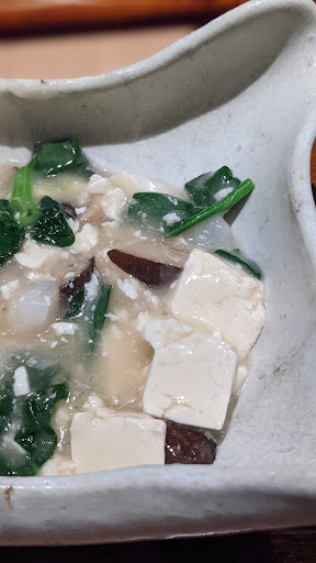入口が数段の半地下で、薄暗くてちょっと入りにくい感じがしますが、中程の厨房の手前と奥に客席があり、細長いようです。 陶食器にこだわりが感じられ、うっすらと聞こえるBGMに反して、サーブの女子の返事が響きわたっていました。 油を使う飲食店ではありがちな、食器のお盆とトイレ床のベタつきは仕方がないでしょうか。