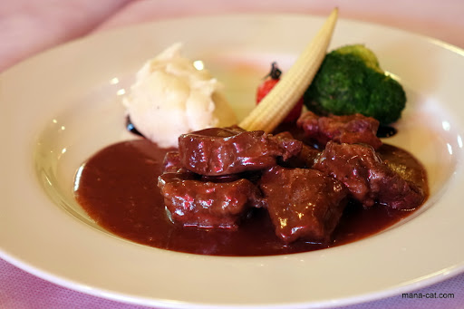 メインの「特製牛たんシチュー」ですが、小さめに切られたタンがたっぷり盛り付けられていて、ワインが効いた酸味のあるシチューはコクもあって味わい深い。タン自体はそれほど良いものでは無いかもしれないが、食べ応えはあってボリューム的に満足。茹で野菜、マッシュポテト共に味わう。最後はパンでシチューを味わい大いに堪能させていただきました。