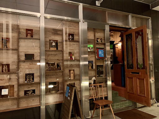 店内もとっても良い雰囲気。 色とりどりのステンドグラスでボトルを象った格子状の板をはじめ、木の使い方にセンスを感じます。