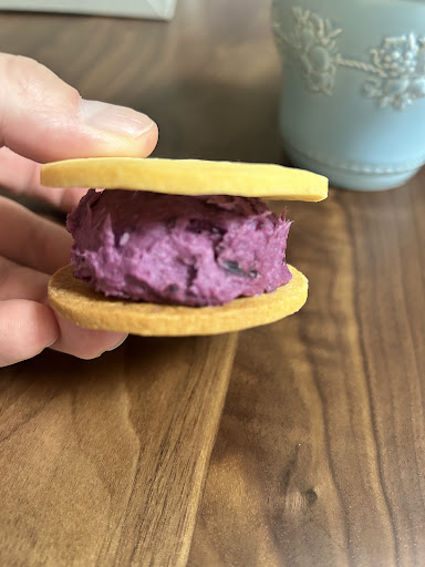 ブルーベリーバターサンドは、 マターリしてて食べ応え充分♡ バターに、ブルーベリージャムを混ぜ込んだものですが、 ホワイトチョコみたいな感じでめちゃうま♡ と、妻が言ってました♡♡