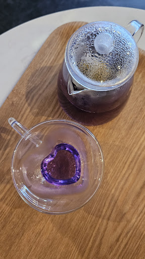 I've been here twice and both times the customer service was top tier. (I can imagine some fans or customers can be a bit troublesome, but the staff were all polite.) We were never rushed out and I actually saw the staff carry a baby carriage up the stairs! (I almost never see that in Japan!) The drinks are delicious and cakes are good, but the purple donut is very hard. It goes well with hot drinks but might be unexpected for some. (I like donuts with a thicker consistency so for me it was fine.) If you want to watch endless BTS videos, this place is for you. Customers were all ages and ethnicities and no one was rude to anyone. It's funny that my daughter and my friends all agreed--the store manager looks like Park Seo-joon. If you can't escape to Korea, this is a nice place to enjoy a chill time...
