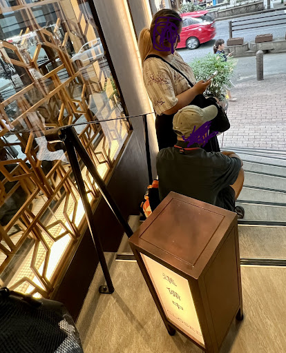 Went here for lunch today. There was one salaryman queuing at the top of the stairs and you can't go in until someone leaves. After he went in, we queued for another 20 minutes until a couple people left. It was a relief to come into the air conditioning. We were seated at a nice table where you could clearly see the chef making the food off a huge griddle. The waitress will bring glasses of water. Menus were all in Japanese, so will need to use Google translate to figure out which okonomiyaki to eat. Must push the buzzer to get service or to order stuff. I had the oyster okonomiyaki ¥1500 which was good. Another had a combination flavored okonomiyaki¥1450 and another had the greasy yakisoba ~¥980. The okonomiyaki was about the width of a regular iphone served on a metal griddle to keep it warm. There is a larger wooden box on the side that has bonito flakes to add to your taste. The smaller wooden box has green spice? to add flavor. It was a very...