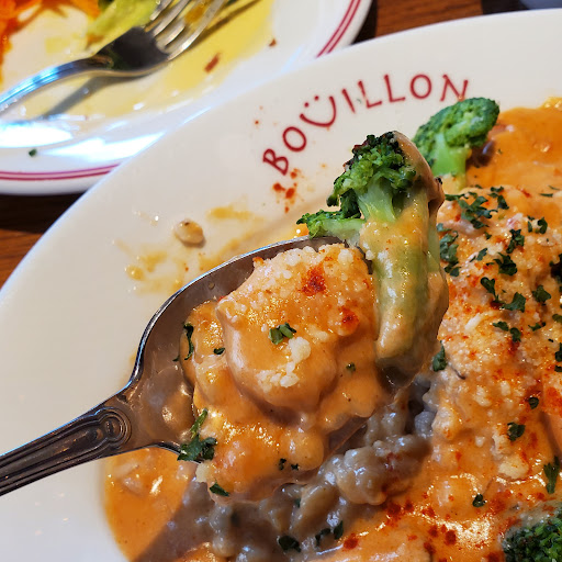 【フランス大衆食堂 ブイヨン本郷3】 【文京区本郷3丁目】 木曜日の12時30分過ぎに訪問。 東京メトロ丸ノ内線本郷三丁目駅から🚶約4 分。 東大病院を受診した帰り道。前から何度もお店の前を通っていて、何人もの人がこちらのお店を勧めていたので、今日は訪問したいと念願叶った。 12時40分で満席🈵お店で食事すると満席になる理由がよくわかる。このお店で「気分が良くなる」からです。 それにぜいたくしないなら、「1,000円ちょっと」でこんな素敵なランチ食べれる都心のど真ん中はないでしょう。 ❇️接客してくれたおねえさま(日本人)がとても感じの良い人で好印象。おねえさま目当てに来店する人が絶対にいそう。フランス人のスタッフもいますね。