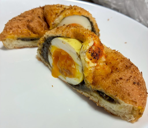 『モンブランホーン』 中にはカスタードクリームがたっぷり入った菓子パン。 きれいに重なってサクサク感とバターの風味がしっかりと味わえるデニッシュ生地は、手でちぎるのが難しいほどもっちりと伸びる。 こちらもパン生地自体が美味い。 両サイドの入口だけ栗餡が入ってて、カスタードクリームとのコラボが楽しいパンでした。