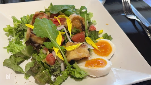 最初はお店チョイスのアミューズ。 メヒカリのフリットをサラダ仕立てにしたもの。 フリットのサクっと、歯応えのあるお野菜たちが上手いこと合ってる。お野菜も美味しいの。(←野菜嫌いw) 大きめのメヒカリって骨が主張しがちだけど、低温じっくりと揚げているのか、全く骨が気にならず。
