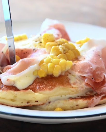 パンケーキの生地はあまあまもっちもち。 ふっかふかのほっかほかでめーっちゃ美味しい。 顔よりでっかいサイズが2枚組の構成。