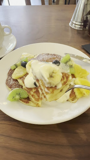 季節のパンケーキは季節によって異なるフルーツが乗ってる模様。 わたしが行った時は、バナナ、パイナップル、キウイ、ブルーベリーという、色彩豊かな目にも優しい夏果実のオンパレード。