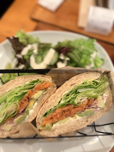 ・サーモンアボカドサンド 全粒粉パンの軽い酸味と香ばしさが印象的で、スモークサーモンの塩気とアボカドのまろやかさが絶妙に溶け合う。 レモンの酸味が全体を引き締め、重たすぎず最後まで飽きない仕立て。 添えられたサラダも新鮮で、ヘルシーながら満足感がある。
