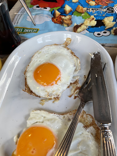 We had the banana & walnut pancakes (3 pieces) and fried eggs plate which was served sunny-side up with breakfast potatoes. Two bites of my pancake did seem to have raw batter around the banana but otherwise the food was delicious.