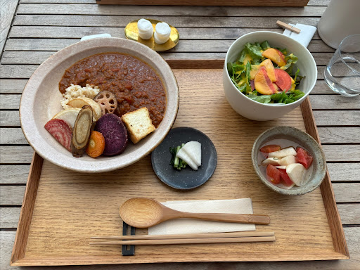Read moreFresh, simple ingredients masterfully combined to create complex dishes to be enjoyed in the peaceful garden area or indoors. As a vegetarian (not vegan), I didn’t feel like the eggs or dairy were missing from the dishes at all. They were tasty all on their own! Gluten free items were not labeled, but the staff were knowledgeable about menu items that were safe or not. I went with the seasonal vegetable curry with rice, that is already completely gluten free. I was told the other lunch options may be made gluten free without the sauce (soy sauce containing). Sadly, we had to skip out on dessert for time reasons, but they did have a fully vegan and gluten free dessert menu also! As a bonus, the outdoor seating area was heated, next to an essential oil store that provided a relaxing aroma, and absolutely beautiful with all the plants filling the area. I would definitely recommend this spot to anyone celiac and/or vegetarian travelling looking for lunch in Tokyo. It would be best, however, to make a reservation. We were lucky to walk in and get a table right away, but there was a quite a line by the time we were done our meal....