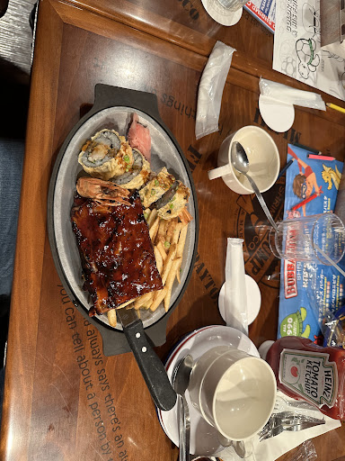 Walked in on a Thursday night for a family vacation dinner. Asked for a window table. Saw two available with Reserved signs. Hostess denied us a table next to window. After 5 minutes two more tables opened up by the window, I asked again and was politely declined again. I ate dinner looking at four empty tables (not all reserved) next to the window; kinda disappointed for that. The waitress suggested I order the Tokyo special plate with ribs and sushi. Then asked with wasabi or without. Of course I want the Wasabi. Didn’t taste any Wasabi and advised the waitress later that there was no Wasabi in my sushi. This isn’t my first sushi order and I am confident I know what Wasabi tastes like. The rest of the food was great. Kids enjoyed their pasta and burger kid meals. Refillable Coke Zero is always my favorite. Wife ate the Jumbalaya and I enjoyed a few bites of the spicey shrimp, sausage, and rice plate as well. I wanted to add some souvenir purchases to the ticket and call it a night. No shirts in XXXL size caused me to pass on purchasing cool shirts. I was able to buy the wife a shot glass and a tshirt so that was nice. Then the charges came to my credit card; purchase at the shop (no problem 35usd), and billed twice for dinner (hoping one of the charges will drop off when someone realizes the error) maybe I have to call Amex to get the duplicate charge removed for our food (about 75 usd). Overall, I was denied a window seat for no obvious reason, food was okay, the shop carried a limited amount of items, and the billing will have to be monitored for mistakes in the future. First and last visit to the...