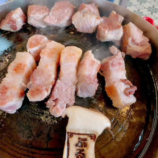 ◯食レポ ・極上熟成モクサルセット 認定試験に合格した焼き士が温度を徹底管理しながら焼き上げる岩中豚。旨味が凝縮されていて、サムギョプサルの概念が変わるほどの美味しさ。英国王室御用達の岩塩でいただくと、肉の甘みがさらに際立ちます。