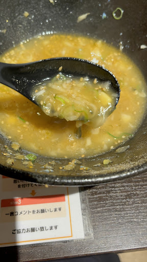 締めには中華スープ。落ち着いた旨味が、暴れた胃をそっと落ち着かせてくれる。 高級油と本枯節を使った“脂っこくない油そば”という謳い文句にも、しっかり納得。