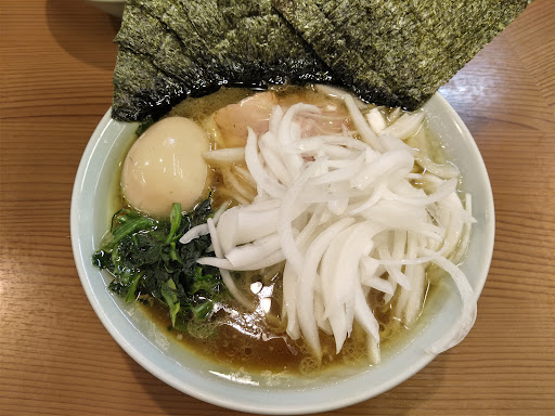 チャーシューは吉村家寄り。スモーキングで、かつ内部はしっとりで美味しい。味玉の半熟具合は見事。玉ねぎのトッピングは完全に失敗だった。細かいみじん切りを期待したが分厚いスライス。麺とも全く絡まないので丼の中の邪魔者になってしまった。