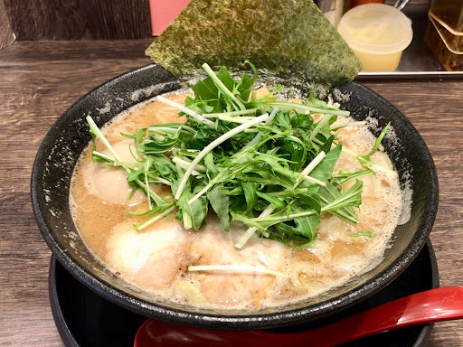 トッピングは水菜が上にどさっと乗って、味玉1個、メンマ、豚バラシャーシュー、海苔などが入ったフルセットです。