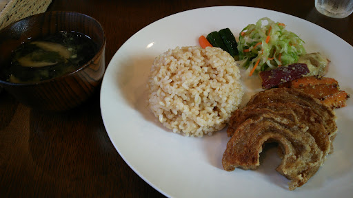 A small friendly place run by one lady on her own. Good regular coffee and seasonal drinks like homemade ginger ale. Also, the food is vegetarian macrobiotic, which you wouldn't expect so far out in the 'burbs of Tokyo. Some people may find it bland, but I've had some really good food here. The lunch sets with drink are about 1200 yen, if I remember, and change daily. It's a good place to relax after the architectural museum and the Hawaiian music is soothing, but since there are not many seats it can fill up quickly at lunch and...