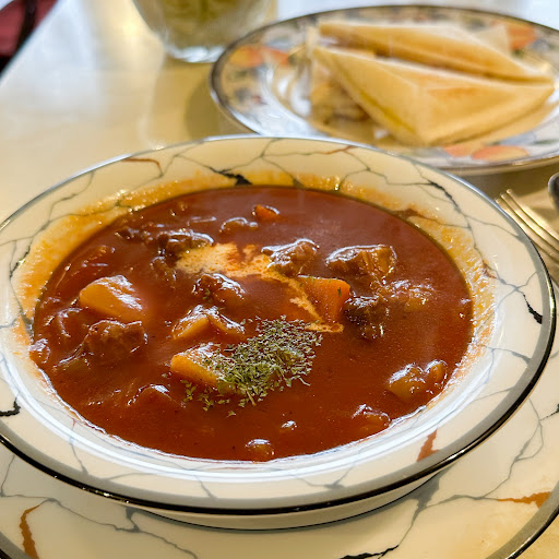 今日は2回目のランチ旨飯探訪。鉄板ナポリタン目玉焼き付き980円はメニュー表にはなく、口コミで気になっていたので、階段の壁メニューを確認してorderした。厨房から鉄板で炒めるジュージュー音がしてくると腹の虫も期待をこめて共鳴する。写真の如く配膳された。ウォ!熱い鉄板の上でナポリタンと目玉焼きが美味しそうに盛り付けられている🤗。一口いただくと喫茶店のナポリタンだ。玉ねぎ、赤ピーマン、ウィンナーがケチャップに程よく絡んだナポから顔を出している。しかし最近パンチョで麻婆カレーナポ小サイズ300gを食べてきたばかりだから200g程の鉄板ナポリタンでは物足りない😞。そうだ❗️メニュー表から気になっていたチキン🍛を追加注文しよう。じきに写真の如く配膳された。一口いただくと良く煮込まれたほぐしチキンが🧅が溶けたルーの中にたくさん入っている。少しも辛くなく小さな子供でも食べられる喫茶店の軽食チキン🍛だよ。普段ピリ辛スパイス🍛ばかり食べているから辛党の人には不向きかな🤔。兎にも角にも喫茶店の鉄板ナポリタンとチキン🍛を美味しくいただけた👍。今日もご馳走様でした🙏。