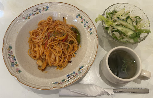 今日は3回目のランチ旨飯探訪。五目炒飯スープ付き850円とポーク生姜焼きスパゲッティ1100円をorderした。待つこと5分で写真の如く配膳された。ポーク生姜焼きスパゲッティは、ナポリタンが別々に盛られているのではなく、塩胡椒のスパゲッティにポーク生姜焼きがミックスしていて予想が外れた😮。五目炒飯はピラフといわないだけあって玉子焼きや刻み野菜炒めが入って和風だから炒飯なのだ。スープ付きといってもいつもの味噌汁が付いてきてやはり和風だ。味は悪くない。前回食べたチキンカレーもそうだったが、どちらかというと和風カレーのようだった。本格的な洋食屋さんのオムライス、ナポリタン、カレーなどを食べたい人は専門店の方がいいかも🤔。街中喫茶店らしい素朴な味だったよ🙂。今...