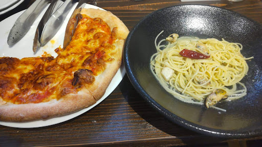 My meet pasta was called curry style, but it wasn't very spicy. I guess I'd rate the flavor slightly above average. The salad was quite good. I'm going to call it a regular four stars, even though there were a number of minor glitches...
