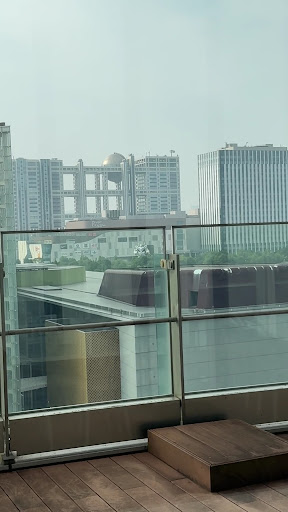 天井が高く解放的なラウンジで大きな窓からレインボーブリッジ、フジテレビ社屋、ダイバーシティが見渡せます。ユニコーンガンダムも見えるよ! 夏はデッキに出るのは暑いけど、季節がいい時には外の席も気持ちよさそう。