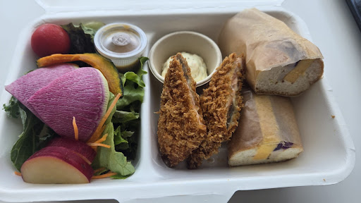 「サンドイッチBENTO」(1,000円)が人気でした。帰るころにはメニューに売り切れの札がはってありました。持ち帰りもできるので弁当スタイルは嬉しいですよね。卵焼きとやわらかいチキンと紫キャベツマリネのサンドイッチも、サーモンフライもソース類も美味しかったです。
