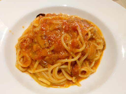 This restaurant offers dishes that are served in colorful hues, such as salads with exuberant cabbage, cherry tomatoes, bell peppers, and ham, and pastas that are bright red from the tomatoes, white from the cheese, and green from the basil. The volume of the dish is one of the key points. Personally, I thought the salad could have used a little less dressing (especially at the end because the watery texture of the dressing made it soggy). On the other hand, there was not that much olive oil drizzled on the pasta, just enough to go well with the mozzarella. The tomatoes also help to give it a crispy taste. This is one of those places to enjoy a nice meal with...