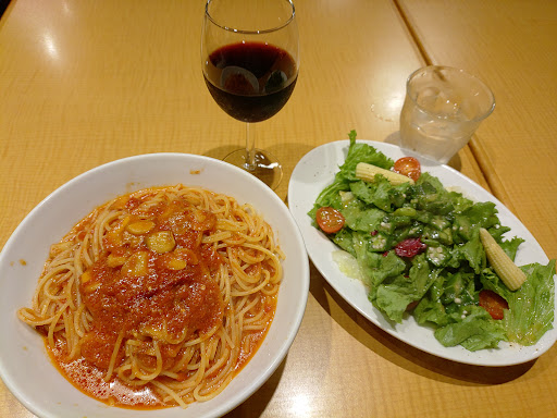 Read more大創業祭「トマニン半額」目当てで平日の20時頃に伺いました 3週目だし、空いてきてるかな?と思いきや 流石の12人待ち〜少ないと思いたいw 20時45分位になると並びは無くなっていたので、敢えて遅い時間帯を狙うのは有りかも 日が落ちても暑い季節ですしね 熱気の残り香に蒸されながら20分ほど待ってから、店舗奥の4人がけテーブルに通される 席の位置が良かったので、閉店時間が近いけどのんびり食べ飲み出来るかな〜と思ってたから、隣の家族連れが夫婦喧嘩を始める… お子さんが先に帰っても続けてるし…… 勘弁してほしいわ と、まぁ、席は良かったが、残念ながら隣客には恵まれ無かったです 初めて来たので、携帯でバーコードを読み込み注文する形式に戸惑いながら 目的のトマトとニンニクのパスタをダブル、サラダセット(本日のサラダ、赤ワイン)で注文 本日のサラダはオクラのグリーンサラダみたいですね、思ったより量が有って驚く 基本、複数名で取り分けする形式なんか? メインのトマニンは大きな器にこんもりと盛られて美味しそうな1杯? 思った以上に多いなと、まぁ問題は無いです、自宅でパスタ作るとコレぐらいの量になるしね(故に外でパスタはあまり頼まない) ニンニクの良い香りを嗅ぎつつ、熱々のをいただきます 以外とさっぱりしたトマトソースにニンニク、チーズが確り効いて美味しい 塩味、油感共に抑えめでいいですね 某コンビニ冷凍パスタは意外と健闘してるのだと思った 姿は見えないけど玉ねぎは入ってそう、裏ごしされてるのか、ニンニク以外の固形具材はない 食べ始めは多少水分ありましたが、直ぐに無くなりドロっとした濃厚なソースのみに〜パスタの固さもちょうど良くなる 配膳されてから、軽く和えて少し待ってから〜が良いのかな?まぁ量があるから気にする事も無いか 途中でタバスコを加えて味変しながら美味しく頂きました ソースがソコソコ残るので、パンとワインを追加して〜とか思ってましたが、隣がアレなので追加する気が失せる 最後にサービスのルイボスティーをいただく ルイボスティーは好きですが、コレは花の香りが良く美味しくですね ...
