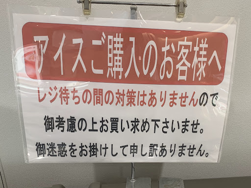 Read more20時前に行ったらアイスはほぼ在庫無し。 供給が間に合ってないそうです。店内には3人の女性スタッフがいましたが、いらっしゃいませ、ありがとうございましたの声も無し。閉店作業の方が忙しいですか?アイスやケーキがお手頃な価格で通っていますが、店員の質はいまいち。別の日ですが、レジでこちらから「袋もドライアイスもいりません」と先に言ったにも関わらず、持ち帰りの時間と袋がいるか聞かれました。店員がワインを注ぐのに手間どり、レジは混雑。レジを待っている間、アイスが溶けても自己責任みたいな掲示もあり。アイスが溶けた事が問題じゃなくて、アイスが溶けてしまうぐらいのオペレーションの質が低い事にお客さんは苛立っているのでは。それを店側に責任が無いって掲示するのもいかがなもんでしょうか。自動精算機が導入されたので、もうそんな店員ならセルフの清算にした方がいいのでは?駐車場も案内の人がいるにも関わらず、入口からから車を出発させる。危うく事故になりそうになる...
